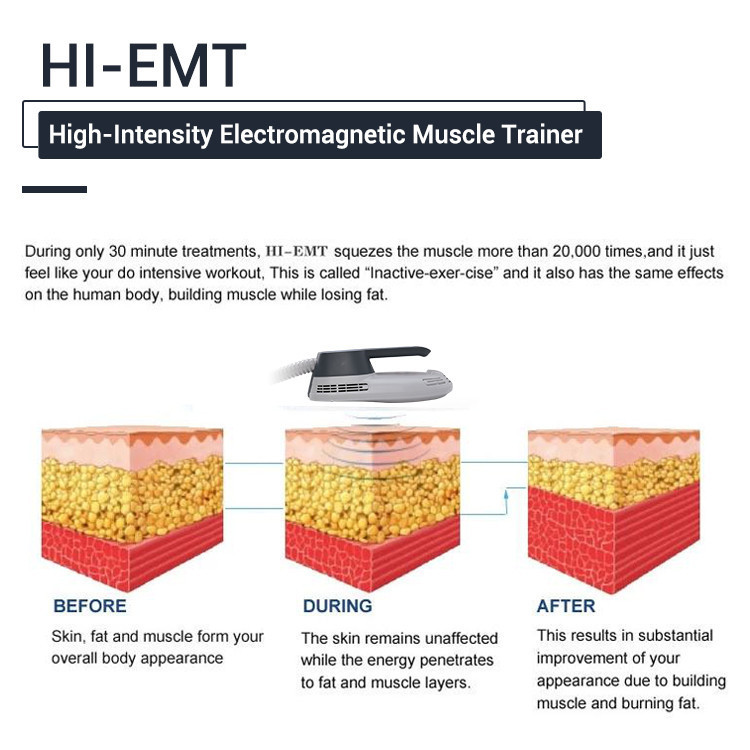 The 100% extreme muscle contraction of HI-EMT technology can trigger a large amount of fat decomposition,Fatty acids are broken down from triglycerides and accumulated in fat cells.The concentrations of fatty acids are too high ,causing the fat cells to apoptosis, which is excreted by the body's normal metabolism within a few weeks. Therefore, slim beauty machine can strengthen and increase muscle, and reduce fat at the same time.