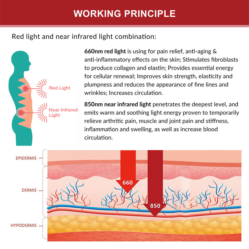 LED Red & Infrared Light Therapy Belt Device - Red light reaches deep layers of the skin, where it stimulates cellular repair and increases circulation to promote a more vibrant, youthful complexion. Invisible(Near Infrared Light) to the naked eye, NIR light is deeply penetrating and cause thermal effects to increase tissue temperature, promote blood circulation, enhance metabolism, improve cell viability and regenerative capacity.