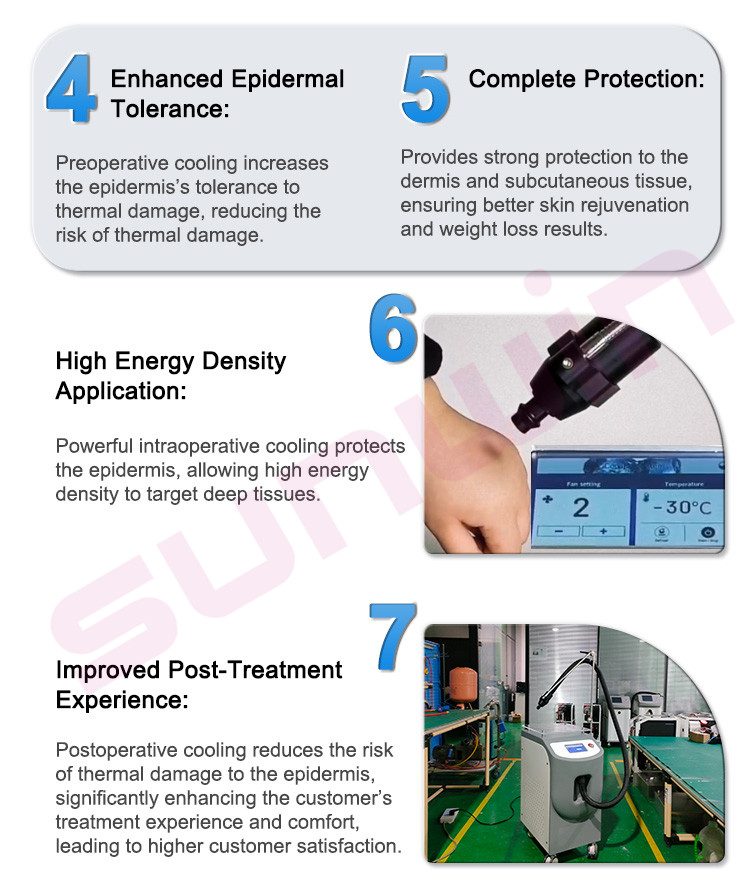 The thermal damage that has already occurred after surgery can also be mitigated by the cold protection provided by the epidermis cooler to alleviate the possible blackening effects. The epidermal cooling fan is cooled by pre-operative cooling, which increases the tolerance of the epidermis to thermal damage, thereby reducing the risk of thermal damage to the epidermis. The Skin Cooler protects the epidermis with powerful intraoperative cooling, making it possible to apply high energy density to deep target tissue. The skin cold air blower protects the dermis and subcutaneous tissue by providing a strong protective effect on the epidermis, thus ensuring better skin rejuvenation, weight loss and sputum. The epidermal cooling fan recovers from postoperative cooling, which reduces the risk of thermal damage to the epidermis and greatly improves the customer's treatment experience and comfort, which is conducive to improving customer satisfaction.